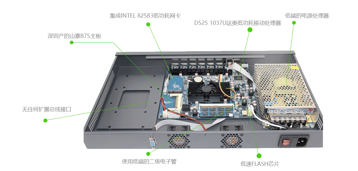 上图中是一款在淘宝网上售价2800元的软路由工控机。拆开以后的内部就是这样的。深圳山寨的B75集成主板(集成6个网卡芯片),30元的低功率开关电源,生产廉价U盘才会选用的低速Flash芯片,无任何扩展总线接口,笔记本内存。I3处理器。看到这里我相信不懂的人还是不懂,懂硬件的朋友已经看的很清楚了。其实就是一句话:所谓的高性能软路由工控机,就是一台山寨集成主板的破电脑。这样的产品还谈什么性能?